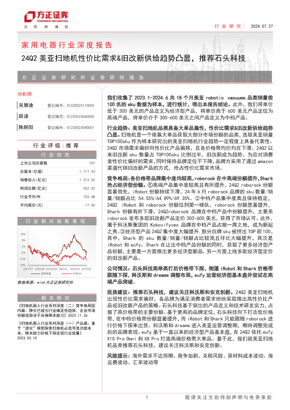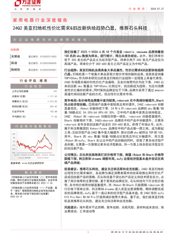 【方正证券】【20240727】家用电器行业深度报告:24Q2美亚扫地机性价比需求&旧改新供给趋势凸显,推荐石头科技-20页