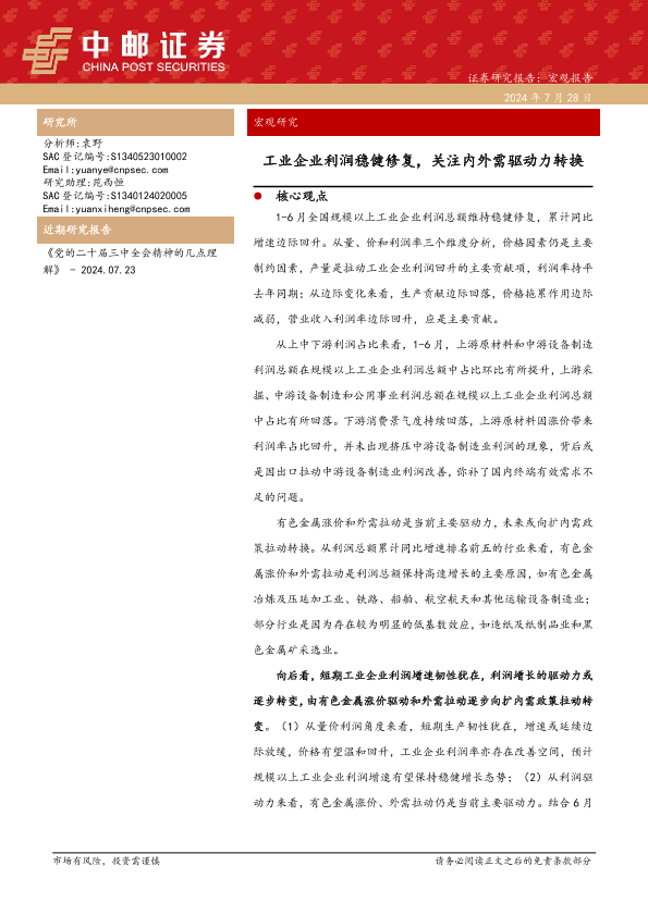 【中邮证券】【20240728】工业企业利润稳健修复,关注内外需驱动力转换-12页