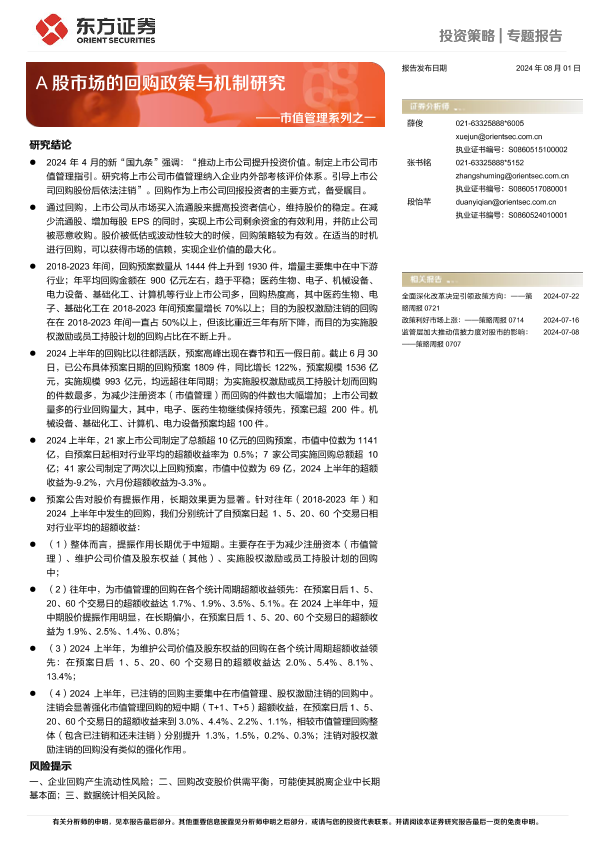 【东方证券】【20240801】市值管理系列之一:A股市场的回购政策与机制研究-30页