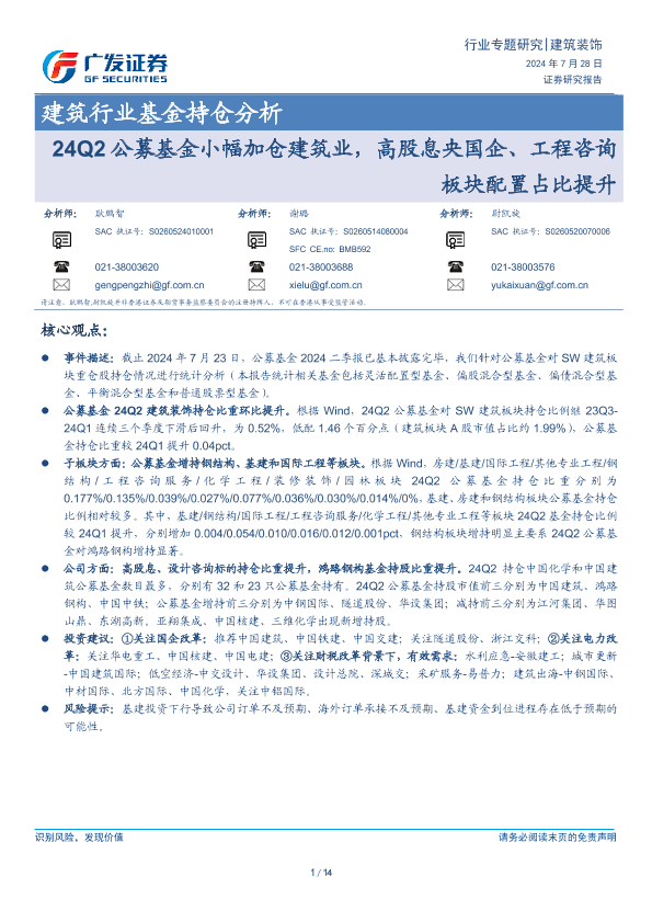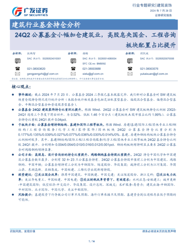 【广发证券】【20240728】建筑行业基金持仓分析:24Q2公募基金小幅加仓建筑业,高股息央国企、工程咨询板块配置占比提升-14页