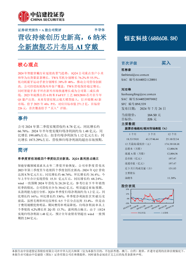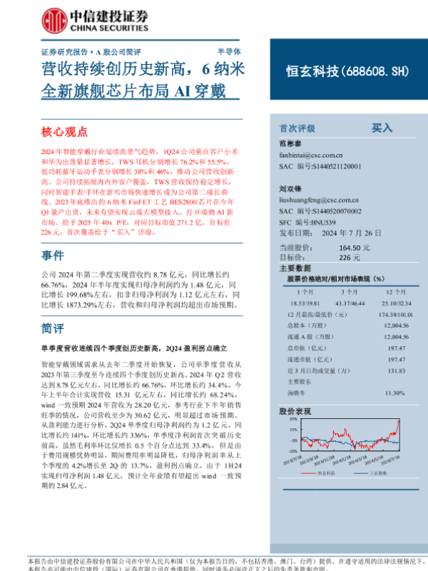 【中信建投证券】【20240726】恒玄科技(688608)营收持续创历史新高,6纳米全新旗舰芯片布局AI穿戴-13页