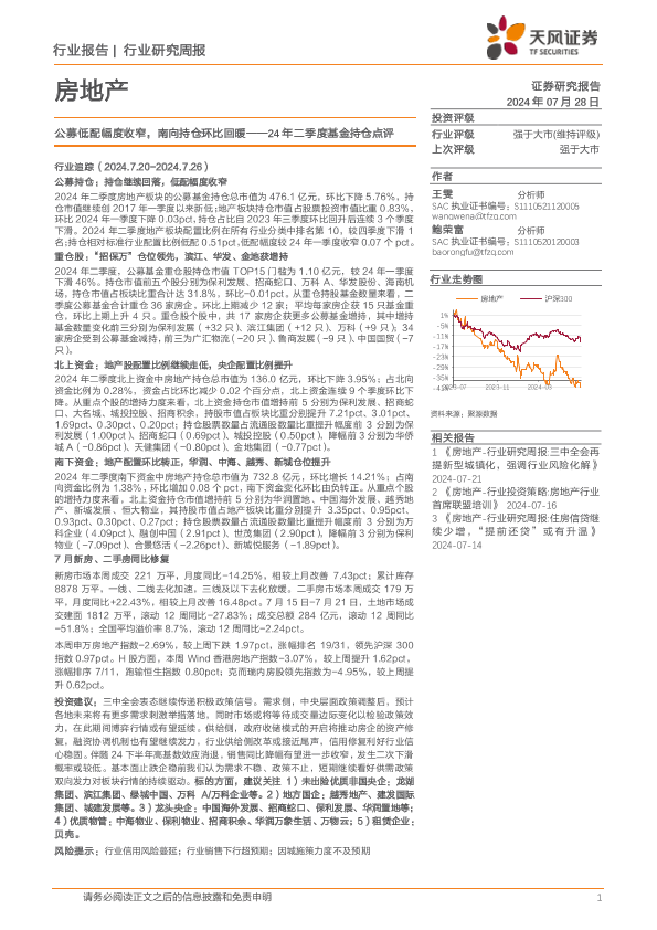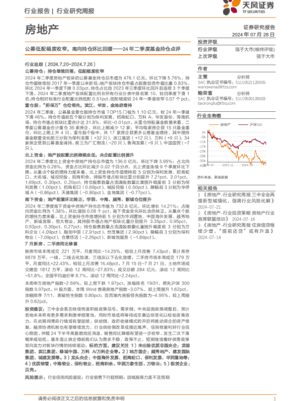 【天风证券】【20240728】房地产行业24年二季度基金持仓点评:公募低配幅度收窄,南向持仓环比回暖-18页