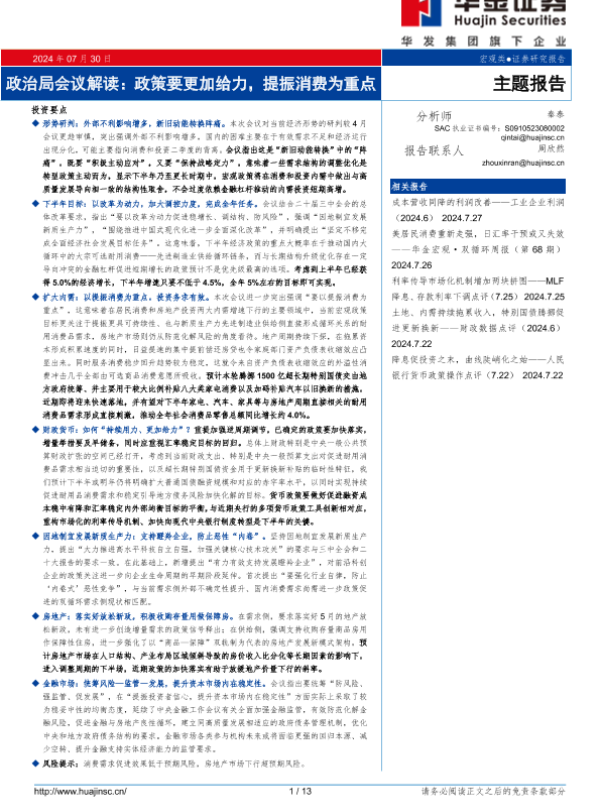 【华金证券】【20240730】政治局会议解读:政策要更加给力,提振消费为重点-13页