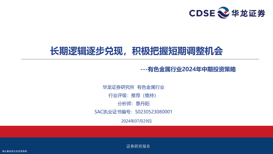 【华龙证券】【20240729】有色金属行业2024年中期投资策略:长期逻辑逐步兑现,积极把握短期调整机会-24页