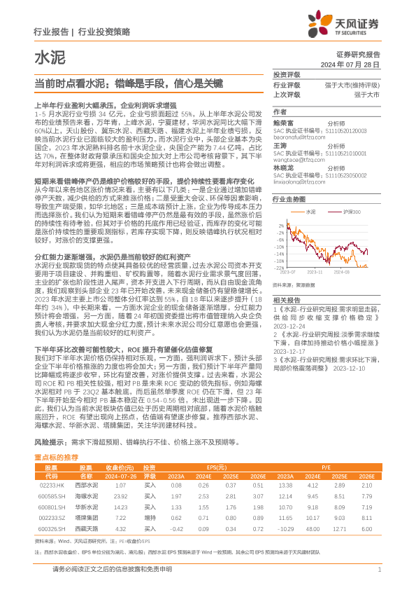【天风证券】【20240728】水泥行业报告:当前时点看水泥,错峰是手段,信心是关键-10页