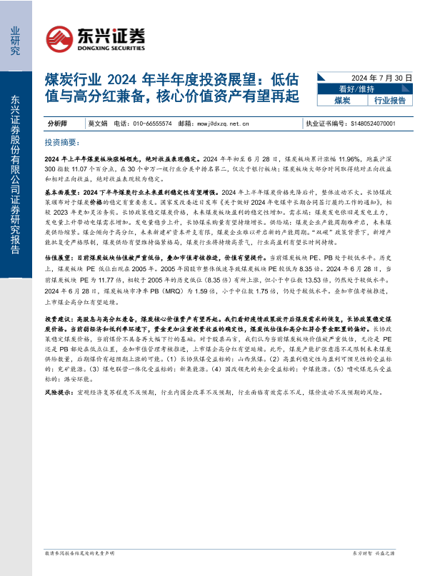 【东兴证券】【20240730】煤炭行业2024年半年度投资展望:低估值与高分红兼备,核心价值资产有望再起-13页