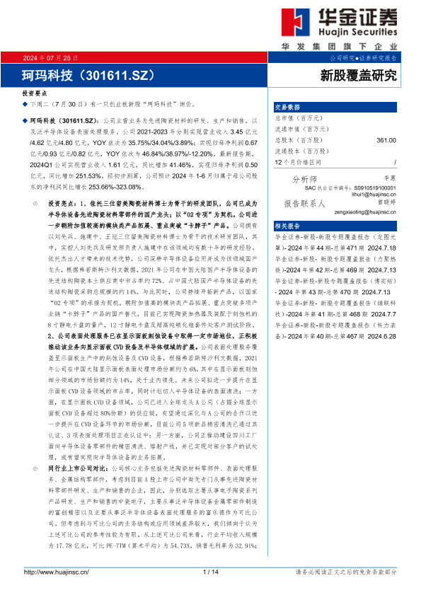 【华金证券】【20240726】珂玛科技(301611)新股覆盖研究-14页