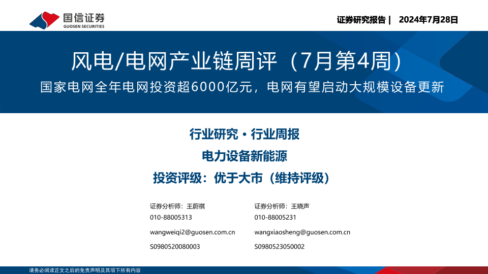 【国信证券】【20240728】电力设备新能源行业风电:国家电网全年电网投资超6000亿元,电网有望启动大规模设备更新-28页
