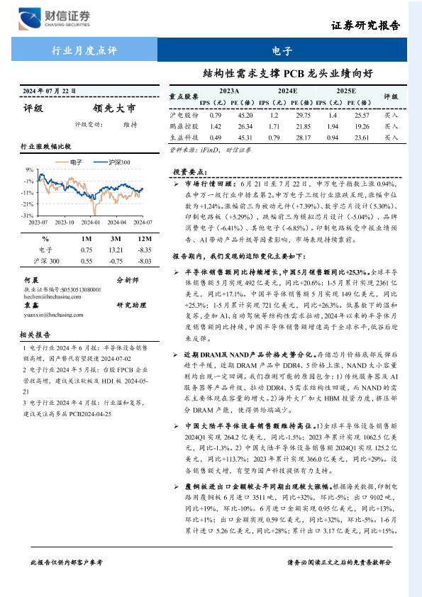 【财信证券】【20240722】电子行业2024年7月报:结构性需求支撑PCB龙头业绩向好-20页