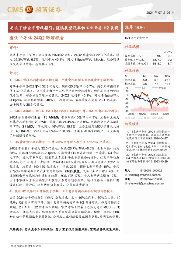 【海通证券】【20240726】电子行业意法半导体24Q2跟踪报告:再次下修全年营收指引,谨慎展望汽车和工业业务H2表现-11页