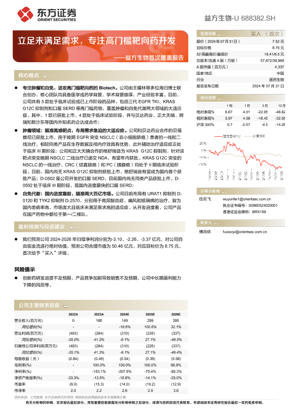 【东方证券】【20240731】益方生物-U(688382)首次覆盖报告:立足未满足需求,专注高门槛靶向药开发-34页