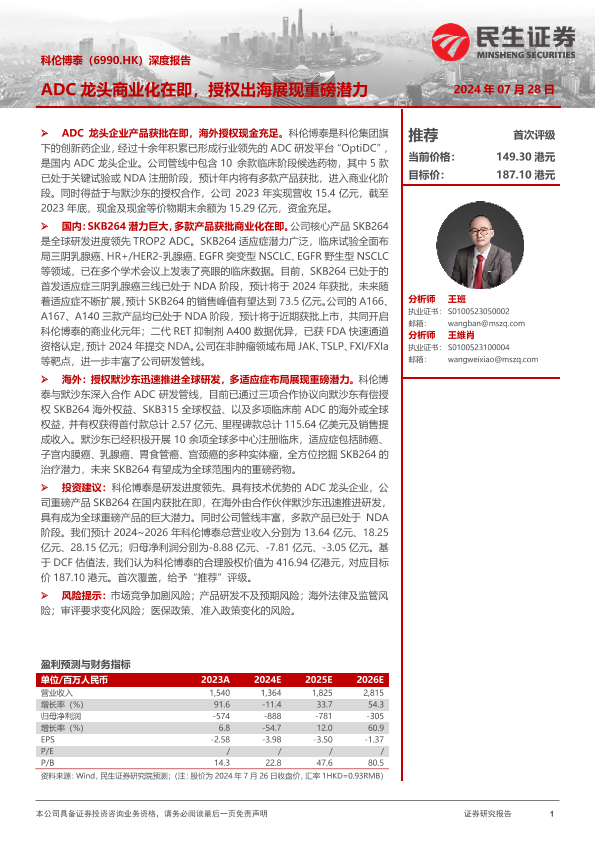 【民生证券】【20240728】科伦博泰生物-B(6990.HK)深度报告:ADC龙头商业化在即,授权出海展现重磅潜力-43页