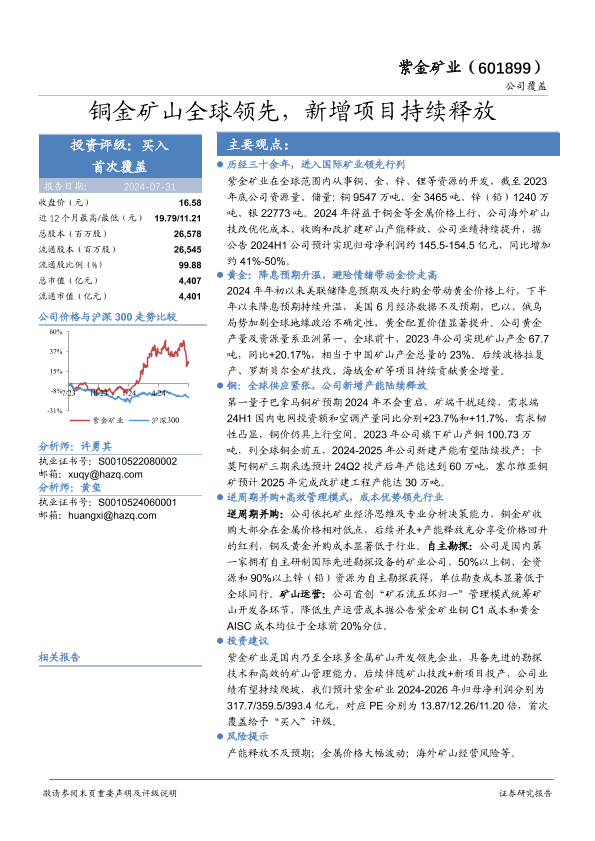 【华安证券】【20240731】紫金矿业(601899)铜金矿山全球领先,新增项目持续释放-22页