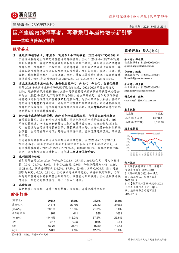 【浙商证券】【20240729】继峰股份(603997)深度报告:国产座舱内饰领军者,再添乘用车座椅增长新引擎-24页