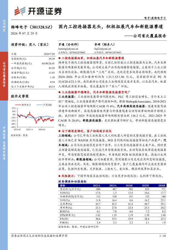 【开源证券】【20240729】维峰电子(301328)公司首次覆盖报告:国内工控连接器龙头,积极拓展汽车和新能源赛道-41页