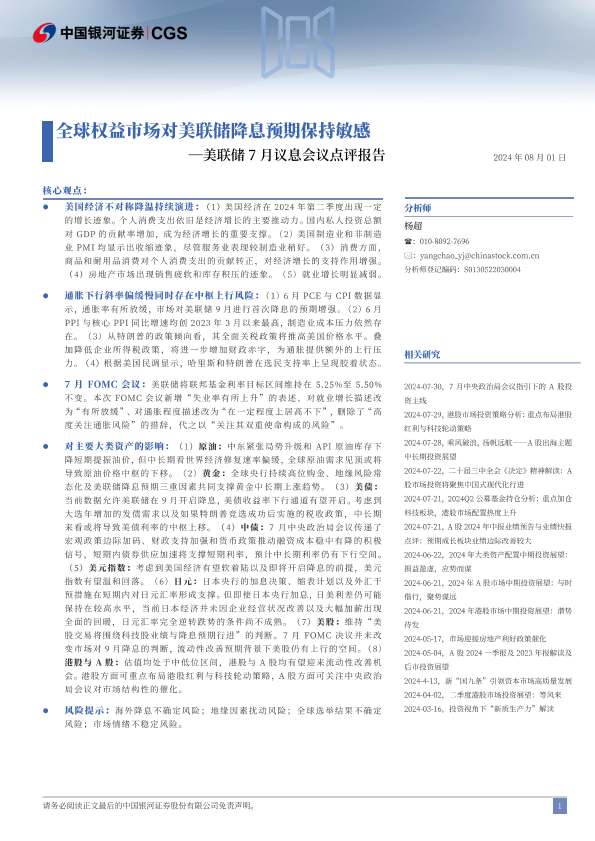 【银河证券】【20240801】美联储7月议息会议点评报告:全球权益市场对美联储降息预期保持敏感-15页
