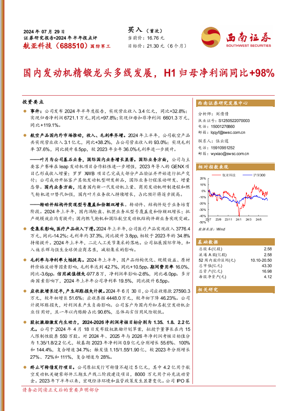 【西南证券】【20240729】航亚科技(688510)2024年半年报点评:国内发动机精锻龙头多线发展,H1归母净利润同比+98%-13页