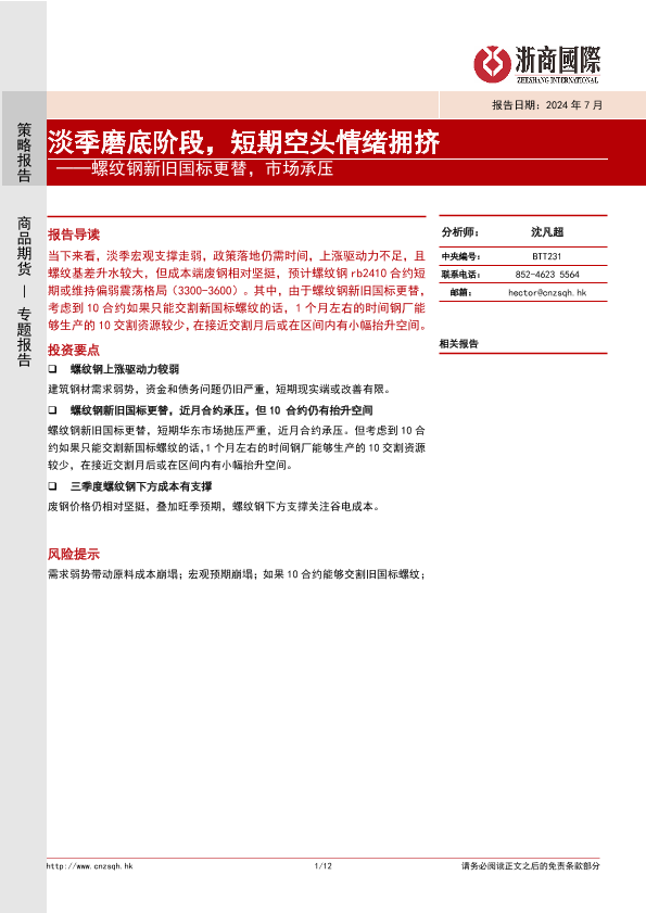 【浙商国际】【20240731】螺纹钢新旧国标更替,市场承压:淡季磨底阶段,短期空头情绪拥挤-12页