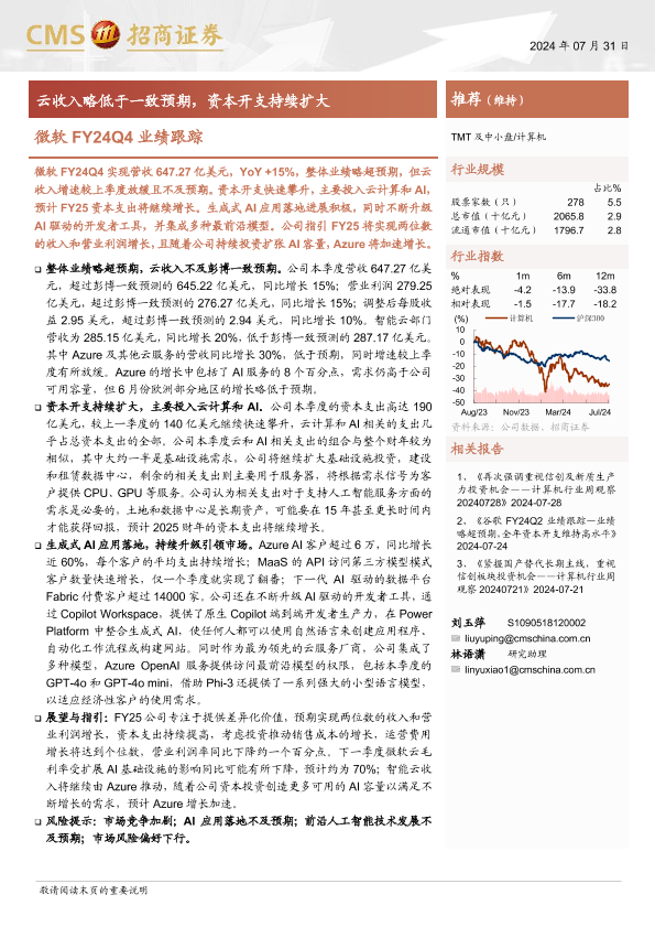 【海通证券】【20240731】计算机行业微软FY24Q4业绩跟踪:云收入略低于一致预期,资本开支持续扩大-16页