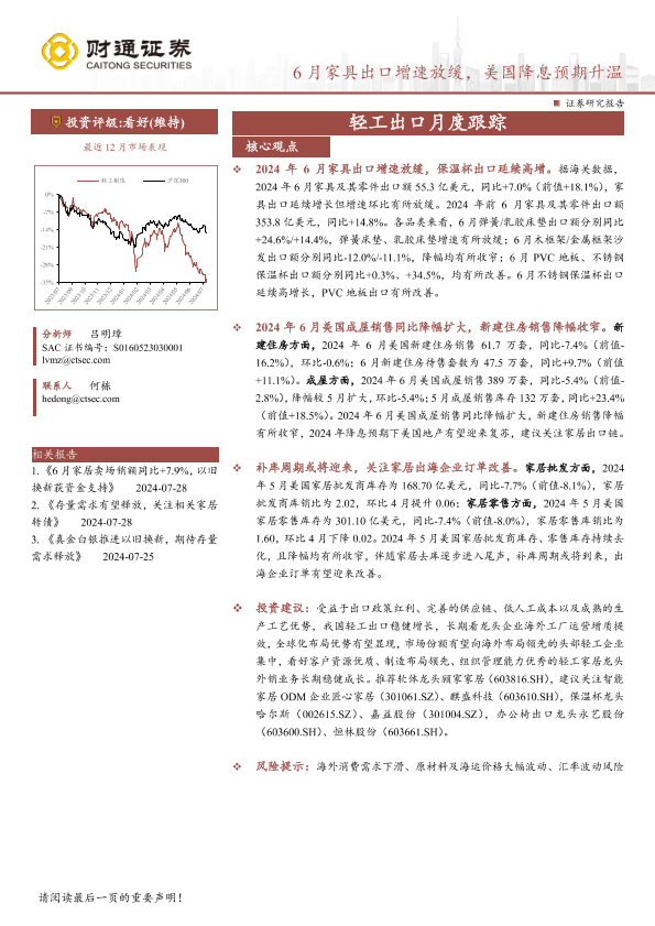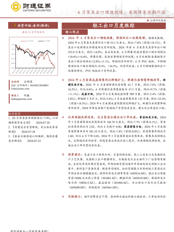 【财通证券】【20240729】轻工行业出口月度跟踪:6月家具出口增速放缓,美国降息预期升温-17页
