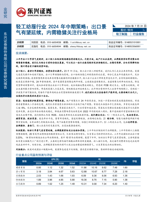 【东兴证券】【20240731】轻工纺服行业2024年中期策略:出口景气有望延续,内需稳健关注行业格局-21页