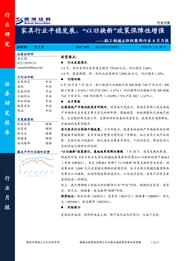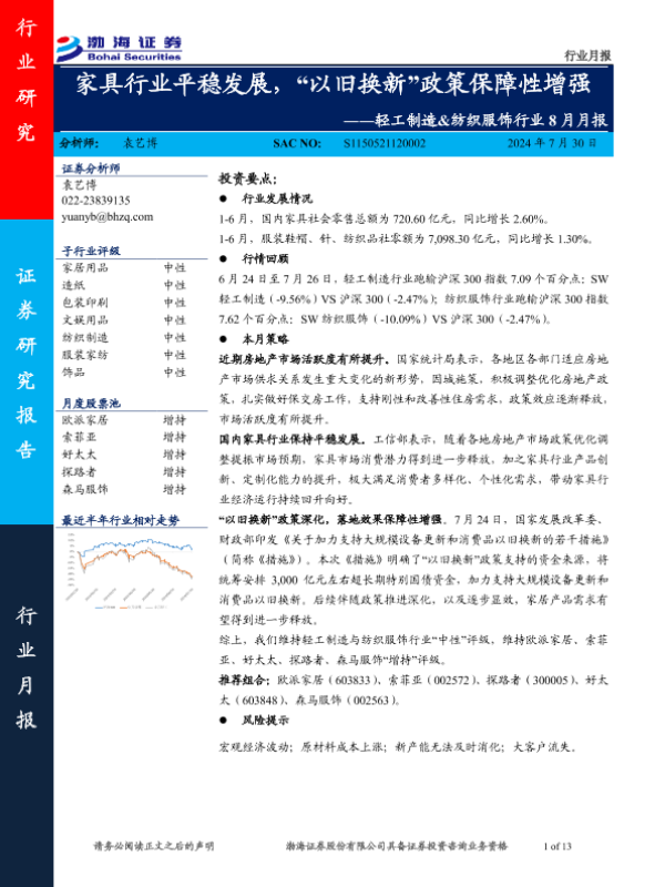 【渤海证券】【20240730】轻工制造&纺织服饰行业8月月报:家具行业平稳发展,“以旧换新”政策保障性增强-13页