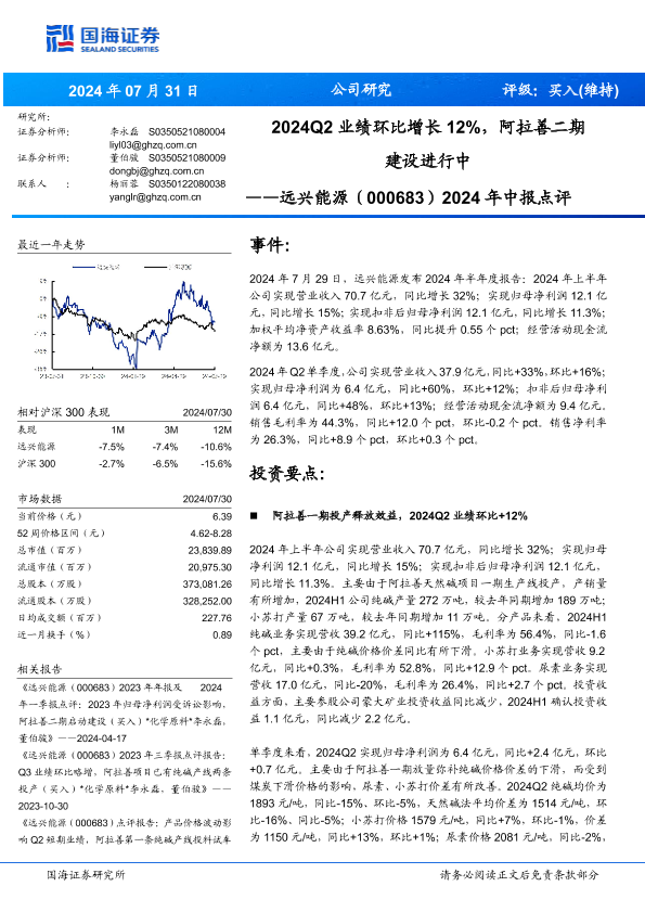 【国海证券】【20240731】远兴能源(000683)2024年中报点评:2024Q2业绩环比增长12%,阿拉善二期建设进行中-10页