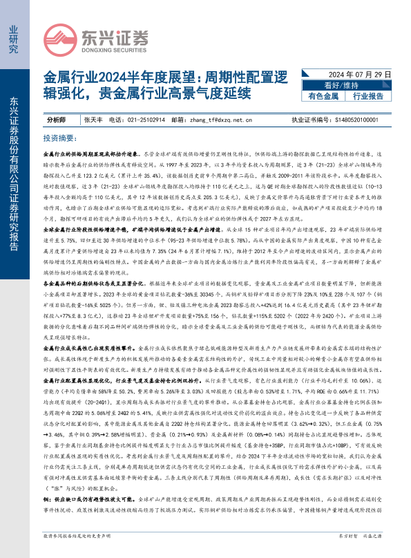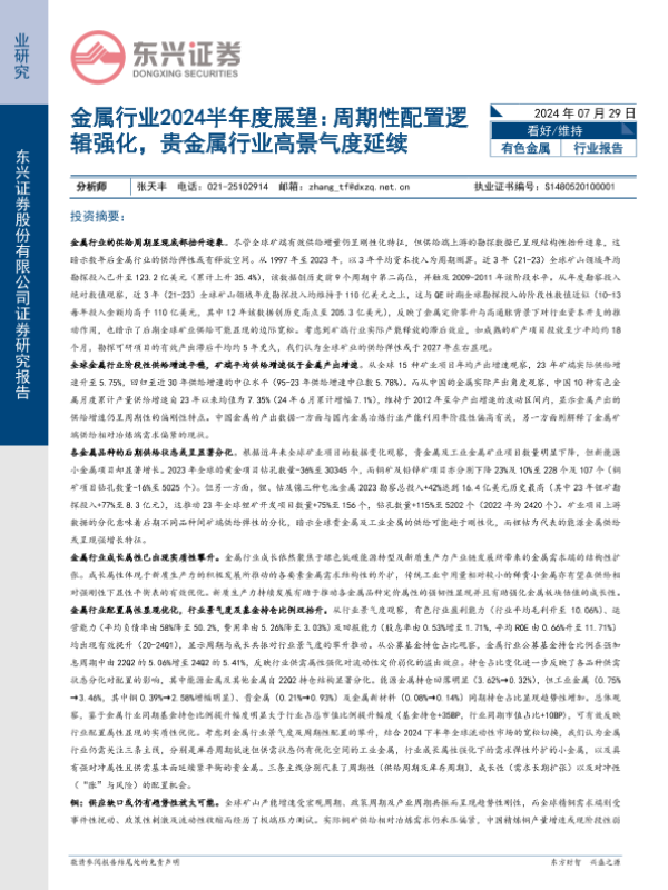 【东兴证券】【20240729】金属行业2024半年度展望:周期性配置逻辑强化,贵金属行业高景气度延续-37页