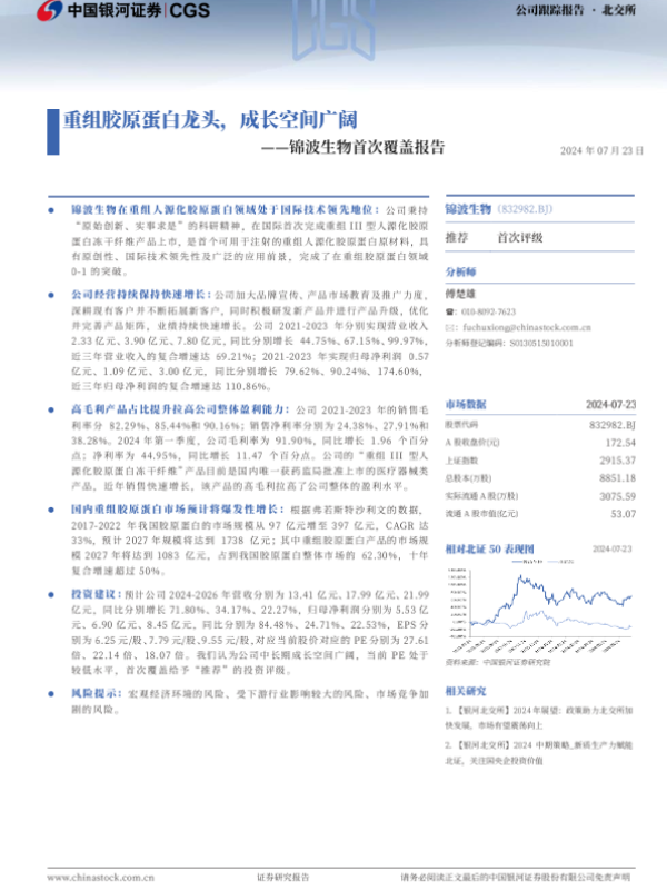 【银河证券】【20240723】锦波生物(832982)首次覆盖报告:重组胶原蛋白龙头,成长空间广阔-14页