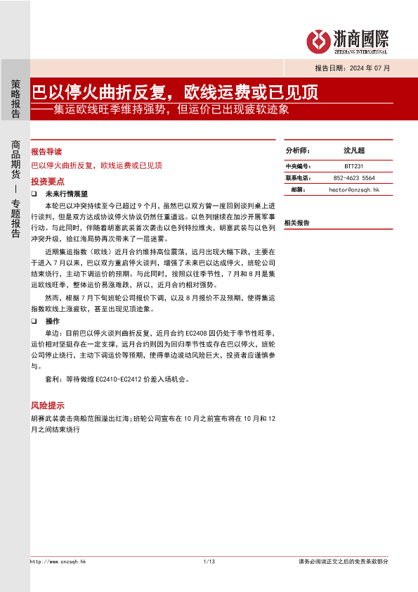【浙商国际】【20240731】集运欧线旺季维持强势,但运价已出现疲软迹象:巴以停火曲折反复,欧线运费或已见顶-13页