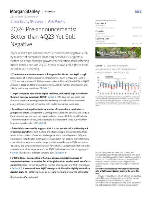 【Morgan Stanley】【20240723】中国股市策略:2Q24预公告优于4Q23但仍为负-24页