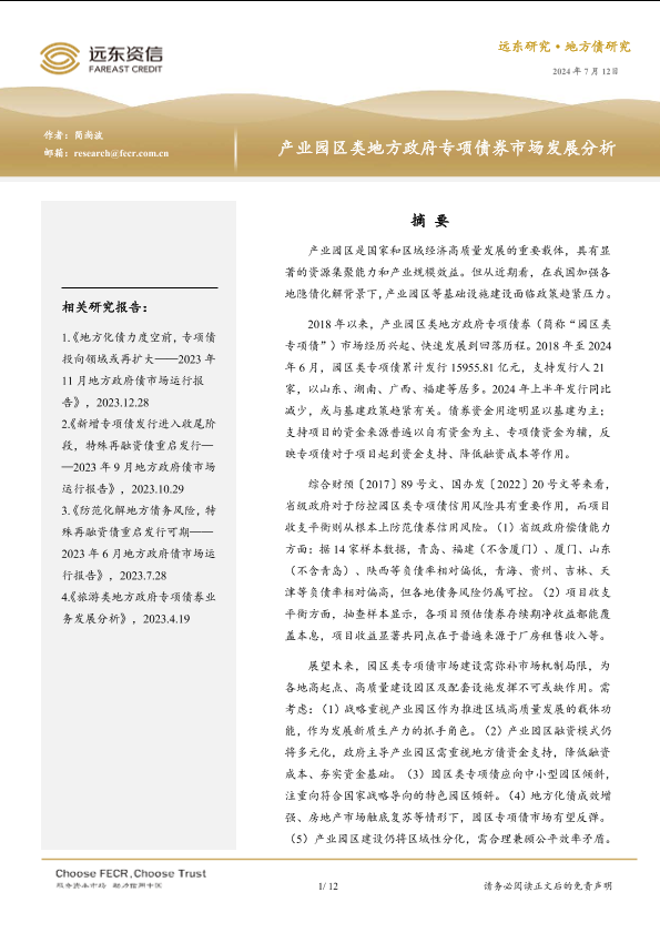 【远东研究】【20240712】产业园区类地方政府专项债券市场发展分析-12页