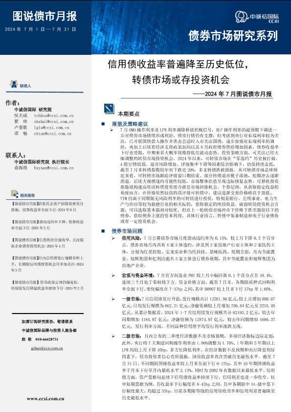 【中诚信国际】【20240731】信用债收益率普遍降至历史低位,转债市场或存投资机会 - 2024年7月图说债市月报-20页