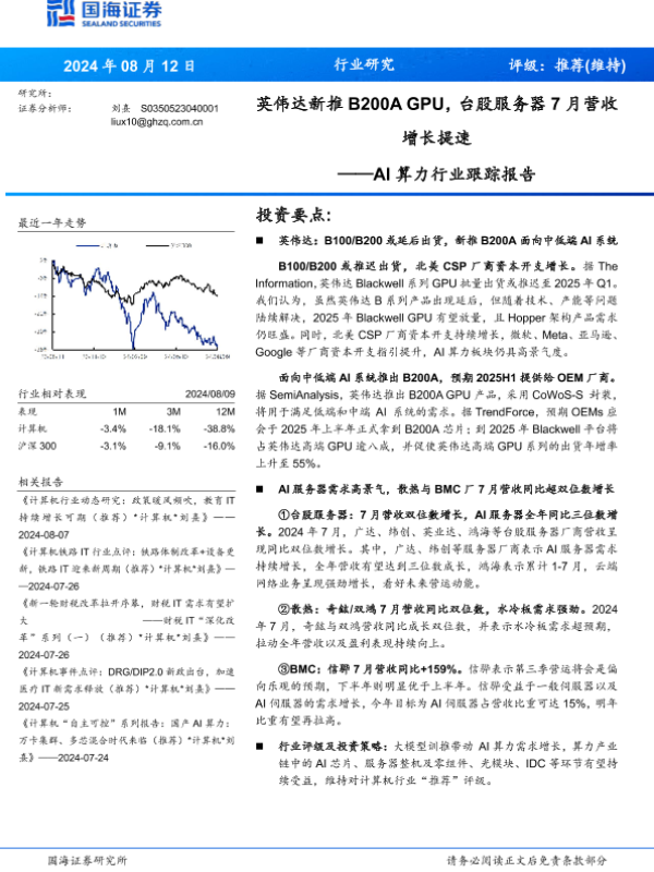 【国海证券】【20240812】AI算力行业跟踪报告:英伟达新推B200+AGPU,台股服务器7月营收增长提速-15页
