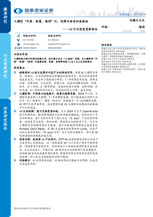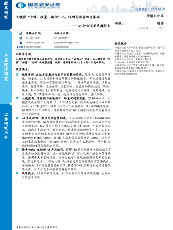 【国泰君安证券】【20240808】AI行业深度更新报告:大模型“开源、轻量、端侧”化,视频与语音加速落地-23页