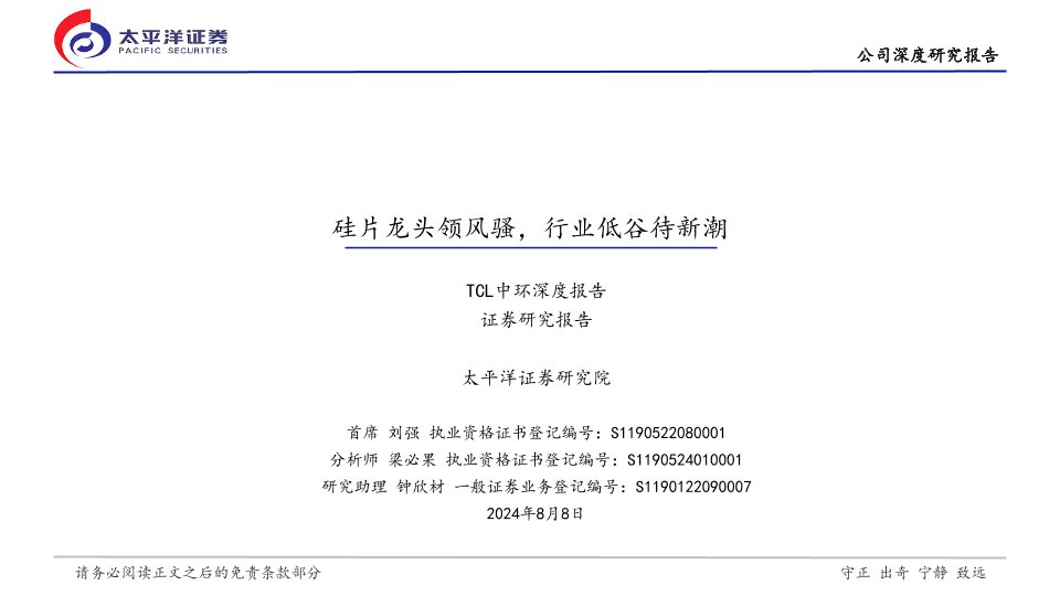 【太平洋证券】【20240808】TCL中环(002129)TCL中环深度报告:硅片龙头领风骚,行业低谷待新潮-27页
