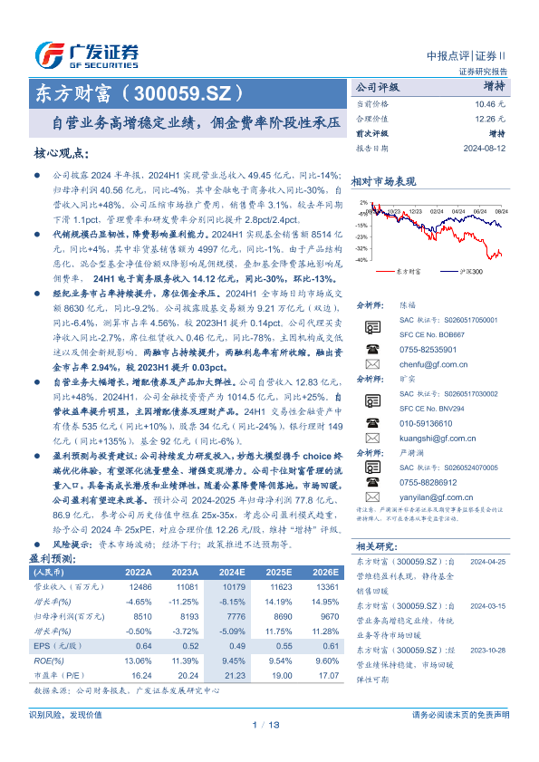 【广发证券】【20240812】东方财富(300059)自营业务高增稳定业绩,佣金费率阶段性承压-13页