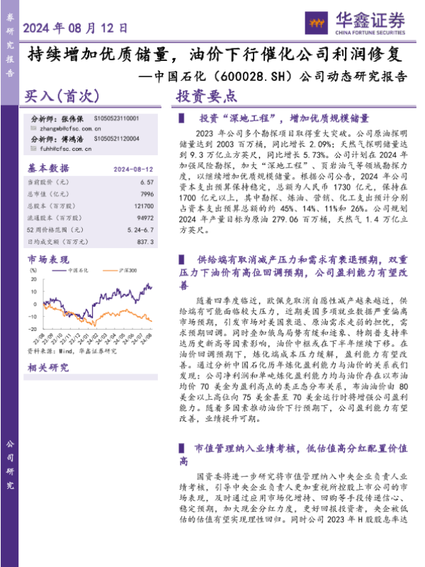 【华鑫证券】【20240812】中国石化(600028)公司动态研究报告:持续增加优质储量,油价下行催化公司利润修复-20页
