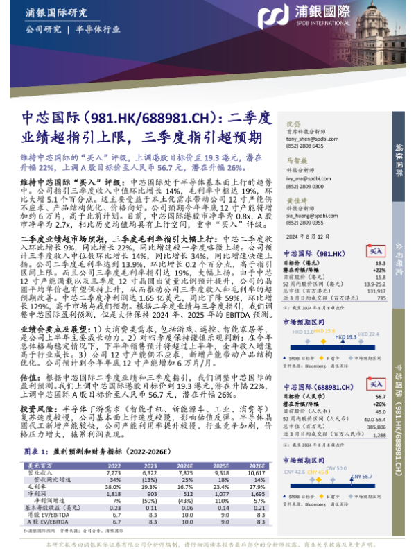 【浦银国际】【20240812】中芯国际(688981)二季度业绩超指引上限,三季度指引超预期-11页