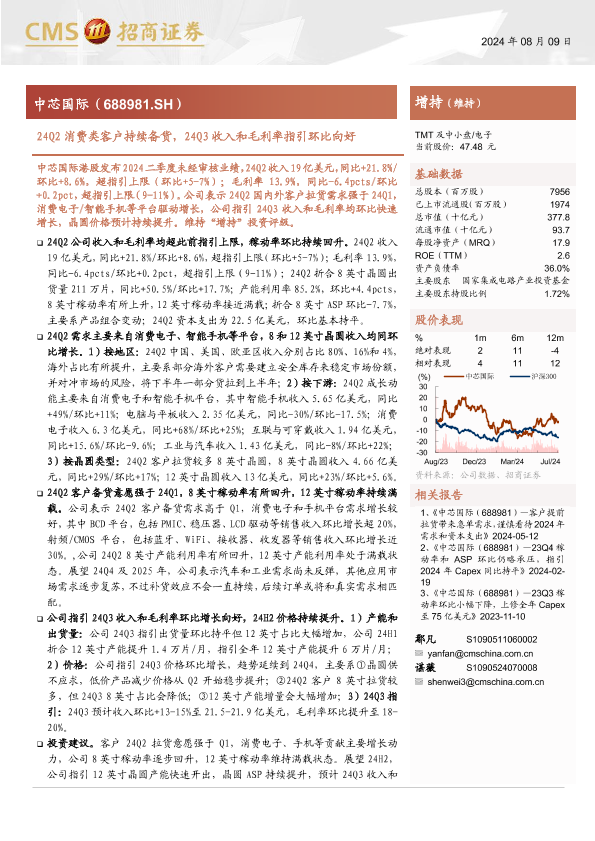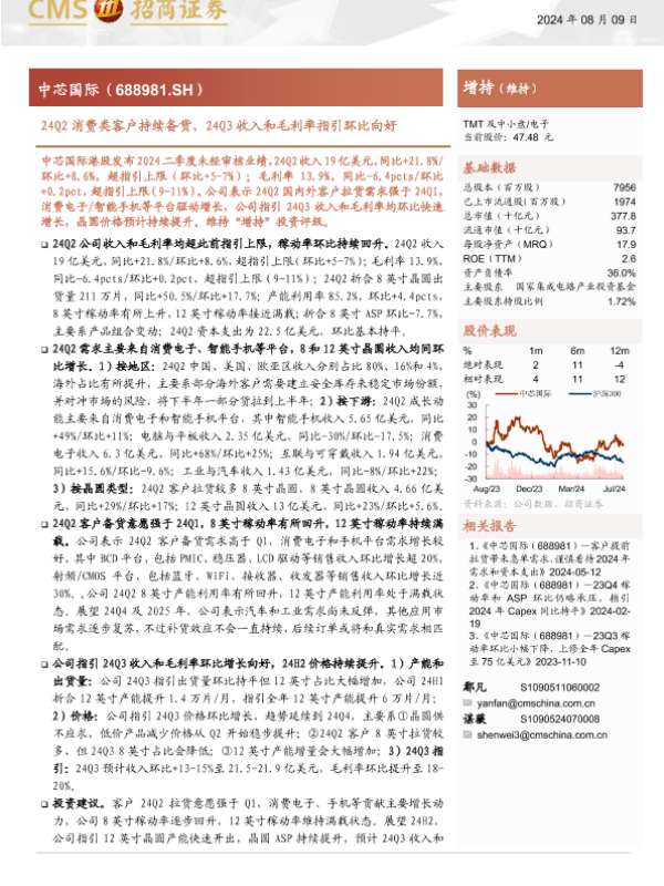 【海通证券】【20240809】中芯国际(688981)24Q2消费类客户持续备货,24Q3收入和毛利率指引环比向好-11页