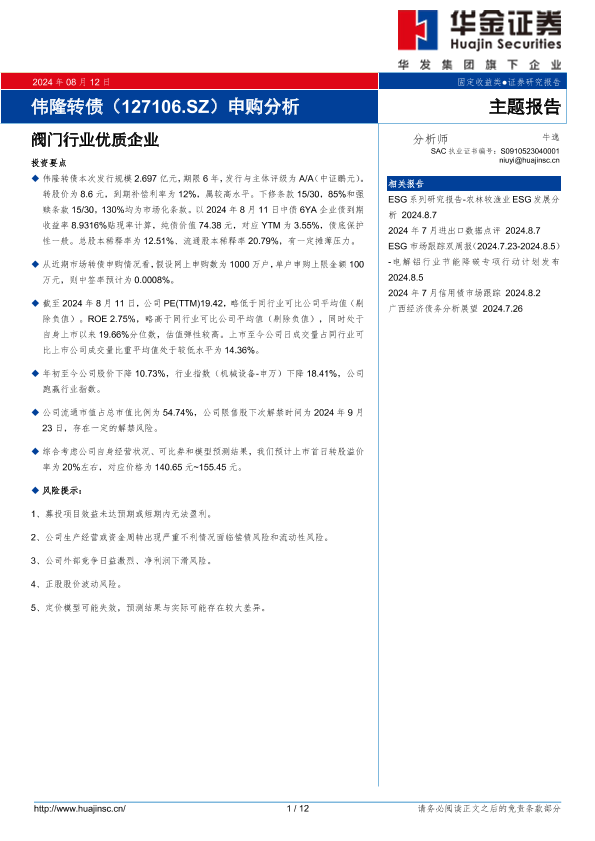 【华金证券】【20240812】伟隆转债(127106.SZ)申购分析:阀门行业优质企业-12页