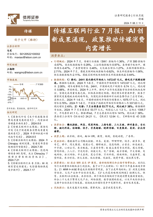 【德邦证券】【20240811】传媒互联网行业7月报:AI创新成果涌现,政策推动传媒消费内需增长-12页