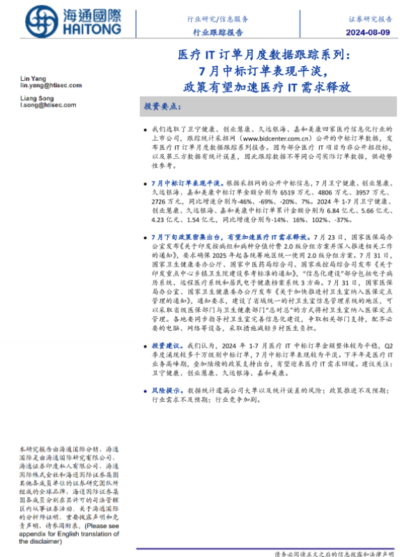 【海通国际】【20240809】信息服务行业跟踪报告:医疗IT订单月度数据跟踪系列,7月中标订单表现平淡,政策有望加速医疗IT需求释放-12页