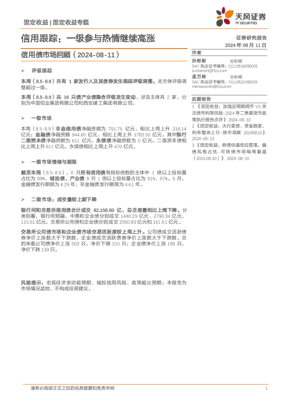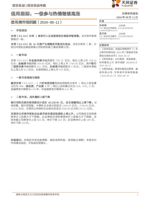 【天风证券】【20240811】信用债市场回顾:信用跟踪,一级参与热情继续高涨-19页