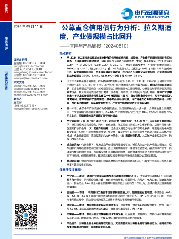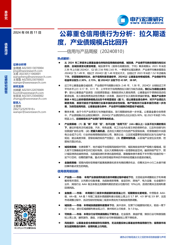 【申万宏源】【20240811】信用与产品:公募重仓信用债行为分析,拉久期适度,产业债规模占比回升-12页