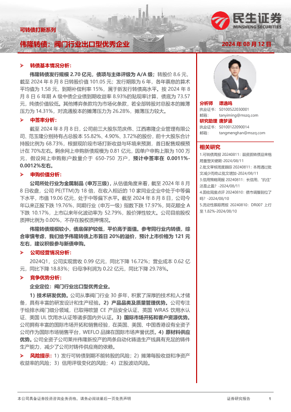 【民生证券】【20240812】可转债打新系列:伟隆转债,阀门行业出口型优秀企业-14页