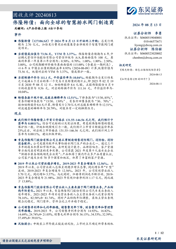 【东吴证券】【20240813】固收点评:伟隆转债,面向全球的智慧排水阀门制造商-12页