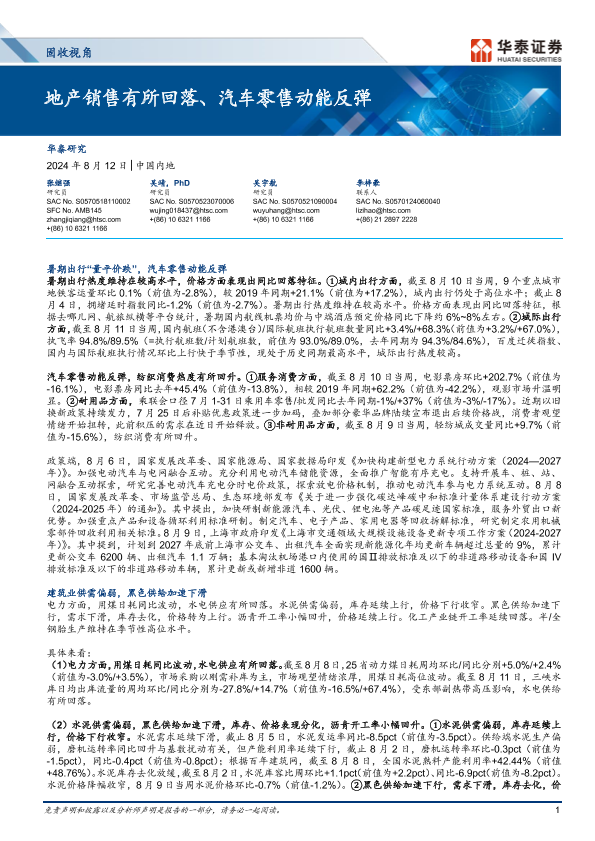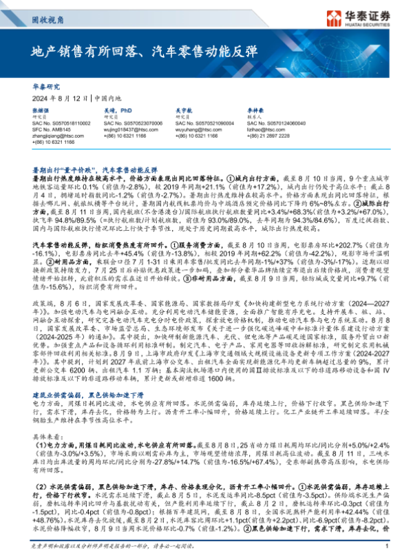 【华泰证券】【20240812】固收视角:地产销售有所回落、汽车零售动能反弹-13页