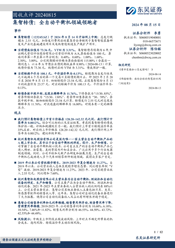 【东吴证券】【20240815】固收点评:集智转债,全自动平衡机领域领跑者-12页