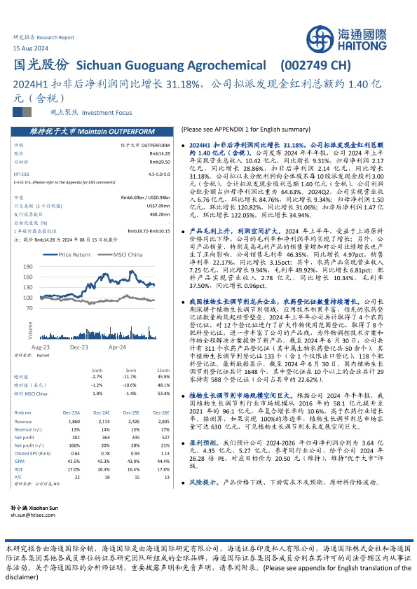【海通国际】【20240815】国光股份(002749)2024H1扣非后净利润同比增长31.18%,公司拟派发现金红利总额约1.40亿元(含税)-12页